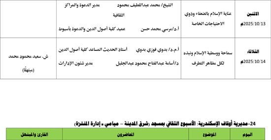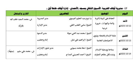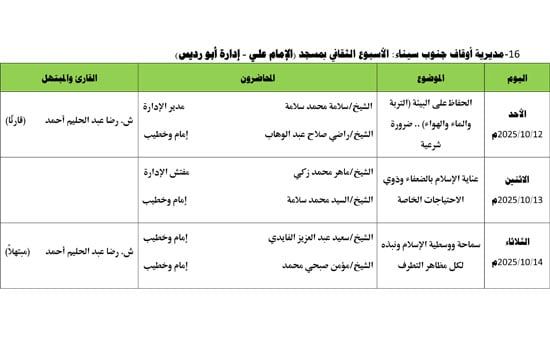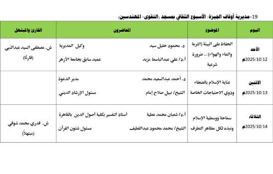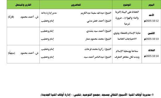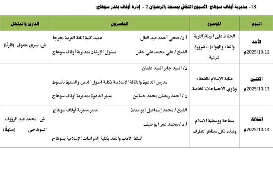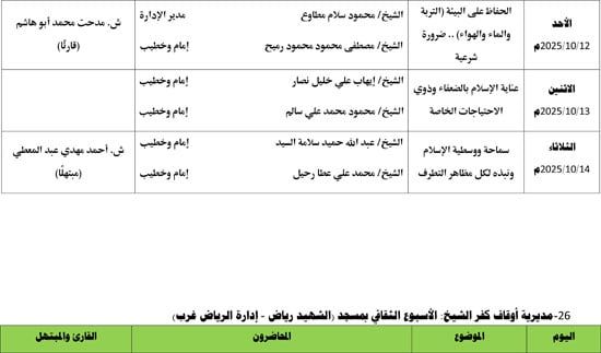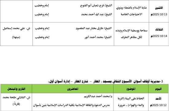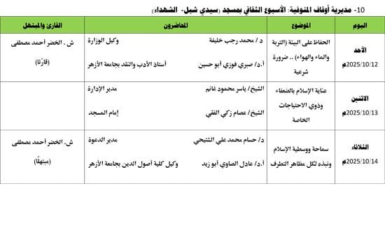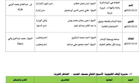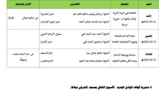تعقد وزارة الأوقاف الأسبوع الثقافي بجميع المديريات بعدد (27) مسجدًا، وذلك في الفترة غدا الأحد وحتى يوم الثلاثاء 14 أكتوبر 2025 م، عقب صلاة المغرب، ضمن فعاليات مبادرة "صحح مفاهيمك" التي تنفذها الوزارة في مختلف محافظات الجمهورية.