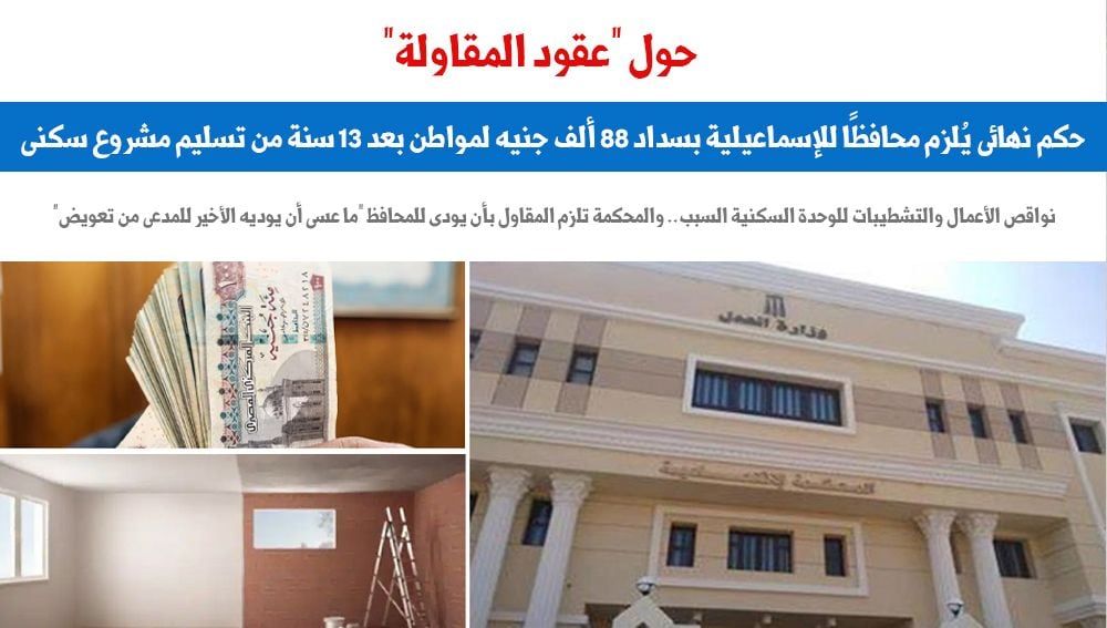بعد 13 سنة من تسليم المشروع.. حول "عقود المقاولة".. حكم نهائى يُلزم محافظا للإسماعيلية بسداد 88 ألف جنيه لمواطن بسبب نواقص الأعمال والتشطيبات للوحدة السكنية السبب.. ويلزم المقاول بأن يودى للمحافظ "ما عسى أن يوديه الأخير للمدعى من تعويض"