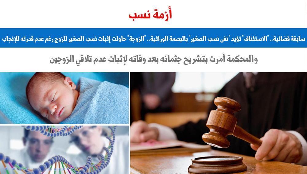 أزمة نسب.. سابقة قضائية.. "الاستئناف" تؤيد "نفى نسب الصغير" بالبصمة الوراثية.. "الزوجة" حاولت إثبات نسب الصغير للزوج رغم عدم قدرته للإنجاب.. والمحكمة أمرت بتشريح جثمانه بعد وفاته لإثبات عدم تلاقي الزوجين
