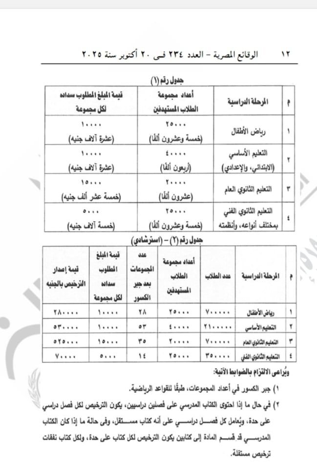 الإثنين، 20 أكتوبر 2025 11:08 صنشرت الجريدة الرسمية قرار وزير التربية والتعليم والتعليم الفنى محمد عبد اللطيف، حيث نص على: تحدد التكلفة المطلوبة التي يلتزم بسدادها مقدم طلب الترخيص بطبع، ونشر الكتاب المدرسي الخارجي، والخاصة بالفحص أو إعادة فحص الكتاب، من خلال ربط نفقات الترخيص بأعداد الطلاب المستهدفين في ضوء الحصر النهائي - الوارد إلى الإدارة المركزية المختصة بشئون المناهج الإجمالي - الأعداد المطلوبة من ذات الكتاب على مستوى الجمهورية عن العام الدراسي السابق لسنة الترخيص، وتقسيم أعداد الطلاب بكل مرحلة دراسية إلى مجموعات، وتكون قيمة إصدار الترخيص هي نتيجة حاصل ضرب قيمة المبلغ المطلوب سداده لكل مجموعة في عدد المجموعات بعد جبر الكسور فيها ، طبقا للقواعد الرياضية وذلك على النحو الموضح بالجدولين الآتيين: