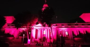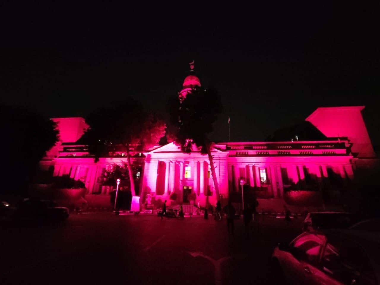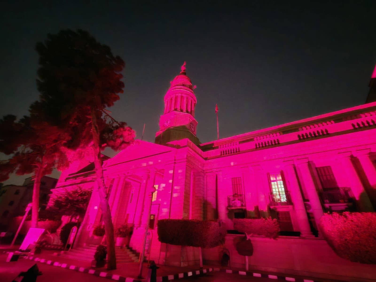 أضيئت قبة قصر العيني باللون الوردي تزامناً مع اليوم التوعوي الذي تنظمه كليه طب القصر العيني ومستشفياتها تحت عنوان (معاً ضد سرطان الثدي) تحت رعايه الدكتور محمد سامي علد الصادق رئيس جامعه القاهره .