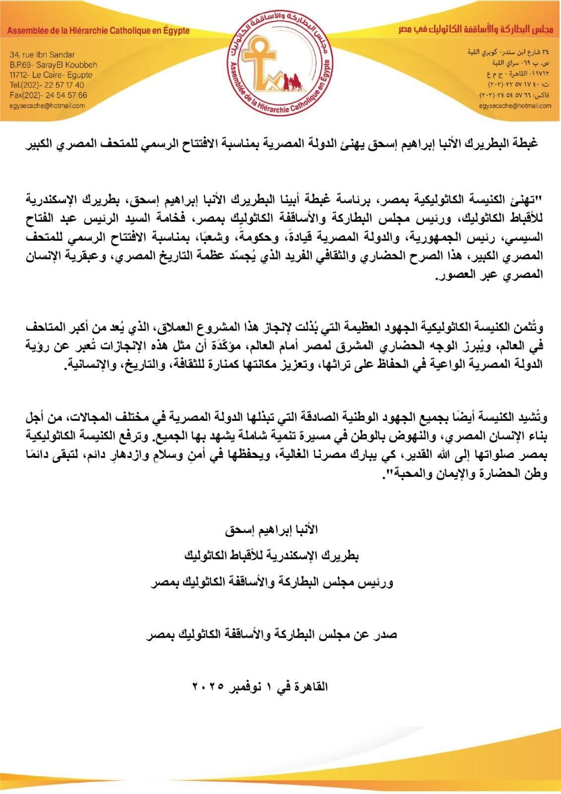 وأكدت الكنيسة في بيانها الصادر عن مجلس البطاركة والأساقفة الكاثوليك بمصر، أن المتحف المصري الكبير يُعد أحد أكبر وأهم المتاحف في العالم، بما يحتويه من كنوز فرعونية فريدة تمثل سجلًّا ناطقًا لتاريخ مصر القديم، مشيرة إلى أن افتتاح هذا الصرح العملاق يعكس رؤية الدولة المصرية الواعية في الحفاظ على تراثها وتعزيز مكانتها الثقافية والإنسانية عالميًا.