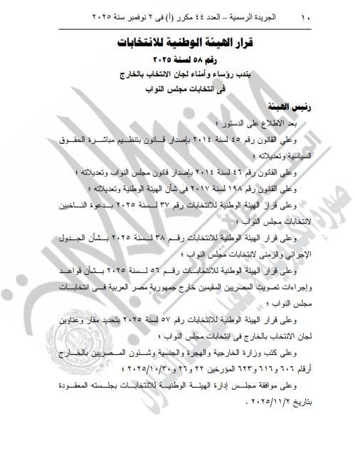 ونشرت الجريدة الرسمية القرار الذى نص على ندب رؤساء وأمناء لجان الانتخاب بالخارج من أعضاء السلك الدبلوماسي بوزارة الخارجية وفقا للكشوف المرفقة الواردة من وزارة الخارجية والهجرة والجنسية وشئون المصريين بالخارج.