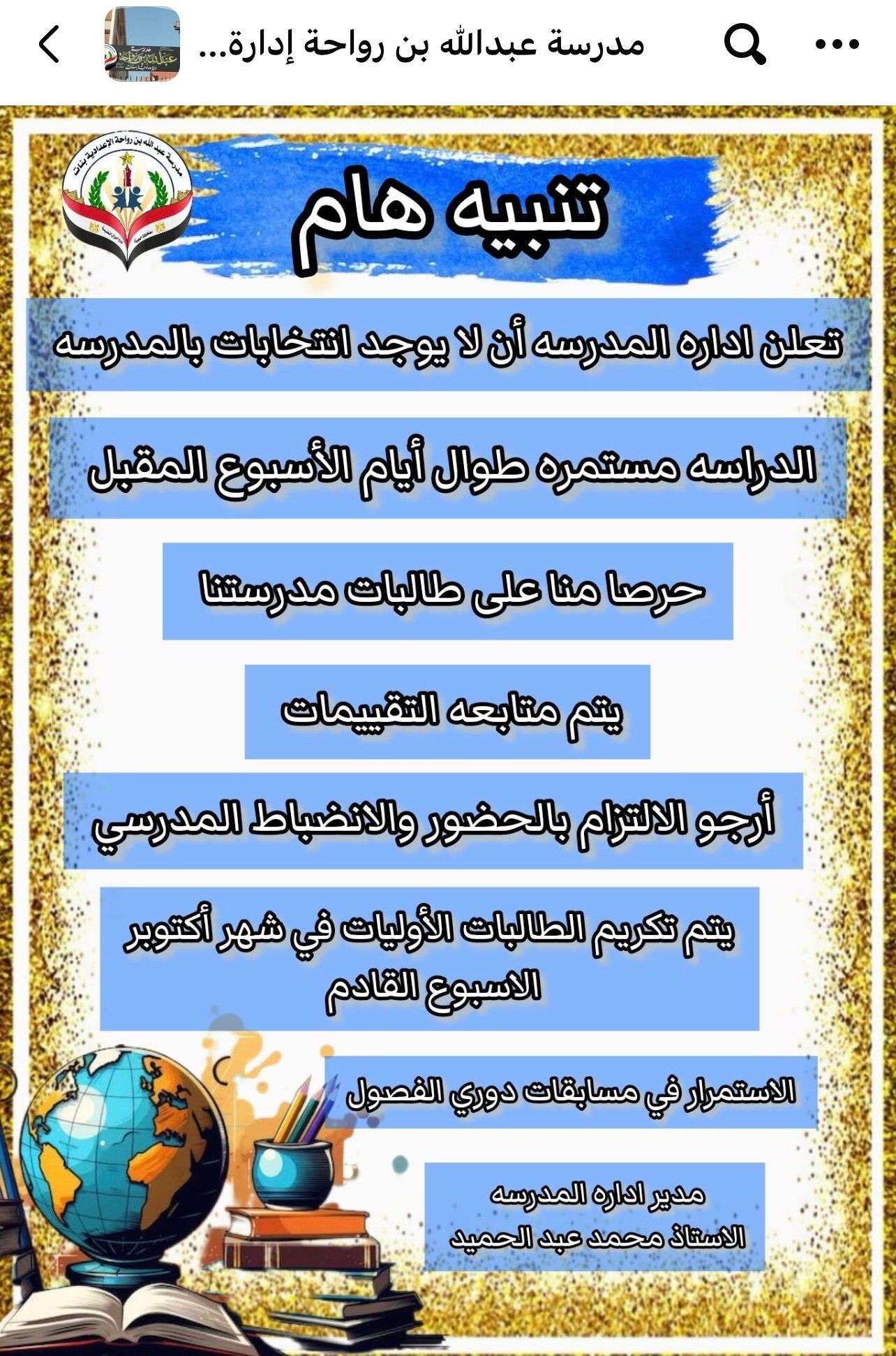 فيما نبهت مدرسة عبد الله بن رواحة الإعدادية بنات التابعة لإدارة الوراق التعليمية عبر صفحتها الرسمية، على أنه لا يوجد انتخابات بالمدرسة، وأن الدراسة مستمرة طوال أيام الأسبوع المقبل، مطالبة الطالبات بالالتزام بالحضور والحفاظ على الانضباط.