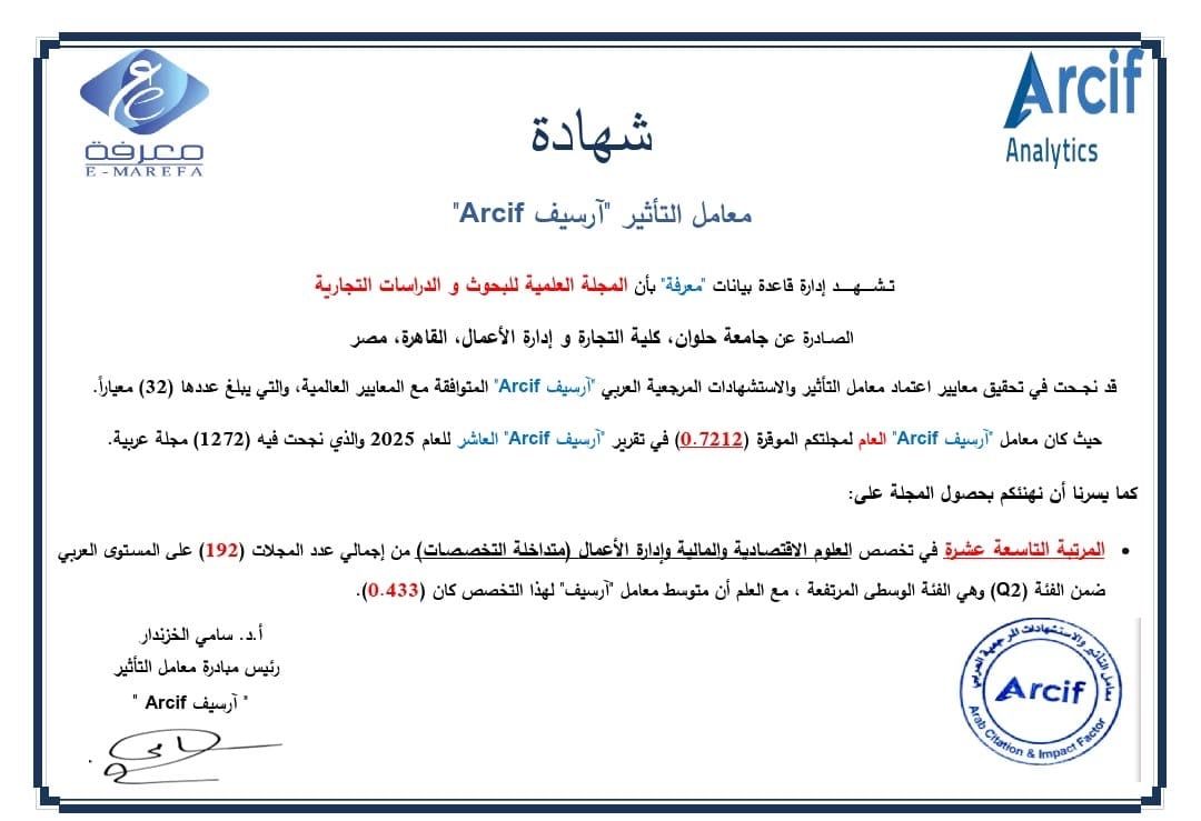 في إنجازٍ علمي جديد يُضاف إلى سجل التميز الأكاديمي لـ جامعة حلوان، أعلن معامل التأثير والاستشهادات المرجعية للمجلات العلمية العربية (أرسيف – ARCIF)، أحد مبادرات قاعدة بيانات "معرفة" للإنتاج والمحتوى العلمي، عن إدراج المجلة العلمية للبحوث والدراسات التجارية الصادرة عن كلية التجارة وإدارة الأعمال بجامعة حلوان ضمن قوائم المجلات المعتمدة لعام 2025، بعد نجاحها في تحقيق المعايير العالمية لاعتماد معامل أرسيف، والتي يبلغ عددها (32) معيارًا دوليًّا.