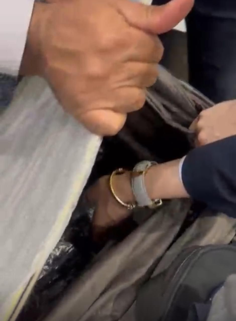 قام عمرو عبد المنعم مدير الإدارة الاولى بالانابة بمعاينة المضبوطات وابلغ عبد العظيم حمادة مدير الادارة الاولى، اشتبه مدير الإدارة بالانابة فى كون المضبوطات من مادة مخدرة فامر بتحرير محضر ضبط جمركى رقم ١٥٨ لسنة ٢٠٢٥ ضد الراكب وذلك بعد العرض على الدكتور ماجد موسى رئيس الإدارة المركزية والذى وجه بابلاغ ادارة مكافحة المخدرات بالمطار لمتابعة اتصالات الراكب ومستقبليه وأيضا اذا كان معه ركاب اخرين، بالفعل بعدها تقدم ضباط مكافحة المخدرات لإدارة الجمرك باخبارية على راكبة من نفس جنسية الراكب الاجنبى، وقادمة على نفس الرحلة قام عمرو عبد المنعم مدير الإدارة بالانابة بتكليف احمد محمد رفاعى مأمور الجمرك تحت اشراف احمد محمد فوزى مدير الحركة المشرف على الصالة الحمراء بتفتيش الراكبة بدقة مما اسفر عن ضبط نفس كمية المخدرات التى تم ضبطها مع الراكب وهى تسعة كيلو جرام وتسعمائة جرام لكل منهما باجمالى يقارب العشرين كيلو جرام وهى كميات تاريخية وغير متكررة بكثرة، وكانت طريقة ضبط الراكبة بصورة مشابهه تماما لضبط الراكب من حيث وجود القاع السحرى وطريق الاخفاء.