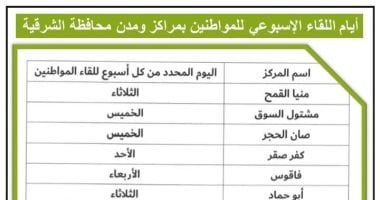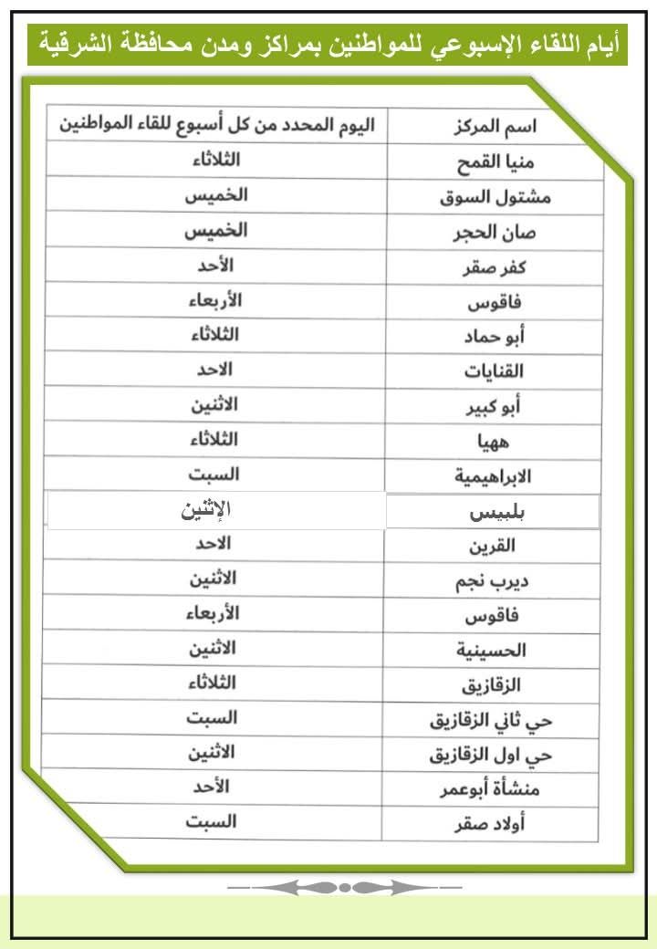 يأتى ذلك تنفيذاً لتوجيهات المهندس حازم الأشموني محافظ الشرقية لرؤساء المراكز والمدن والأحياء بتخصيص يوم أسبوعي بكل مركز ومدينة وحي لفتح قنوات تواصل مباشرة مع المواطنين للاستماع إليهم وتلبية احتياجتهم، وذلك بناء علي توجيهات رئاسة الجمهورية ورئيس مجلس الوزراء وتفعيل المسئولية المجتمعية لتنفيذي الشرقية.