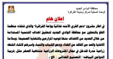 وقال اللواء ياسر كمال الدين رئيس مركز الفرافرة أن البرنامج يهدف إلى توعية المزارعين بالتغذية الصحيحة ، وسلامة الأغذية والحد من الفاقد من الغذاء، ودعم الشباب والنساء واسرهم لإنشاء أنشطة زراعية مدرة للدخل في مجال المشروعات الزراعية متناهية الصغر مثل (تربية الدواجن البياضه / التصنيع الغذائي .. الخ )