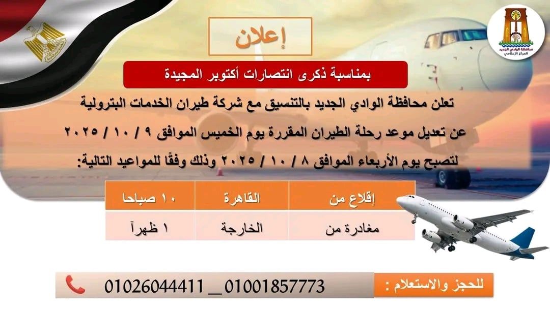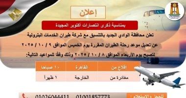 الخميس، 09 أكتوبر 2025 07:00 صأعلنت محافظة الوادى الجديد عن تعديل موعد رحلة الطيران المقررة اليوم الخميس الموافق 9 اكتوبر لتصبح غدا الأربعاء بمناسبة ذكرى انتصارات أكتوبر المجيدة وذلك بالتنسيق مع شركة طيران الخدمات البترولية وفقًا للمواعيد المعلنة على صفحة المحافظة الرسمية على مواقع التواصل الاجتماعى على أن يتم الحجز من خلال الاتصال على مكتب حجز طيران المحافظة.