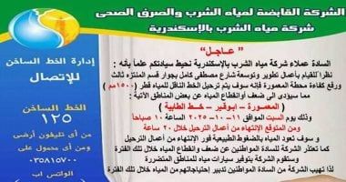 وناشدت مياه الإسكندرية، المواطنين ، توفير إحتياجاتهم من المياه خلال تلك الفترة، وعند الحاجه يرجي الاتصال علي رقم 125 من أى خط أرضى أو علي 035815700.