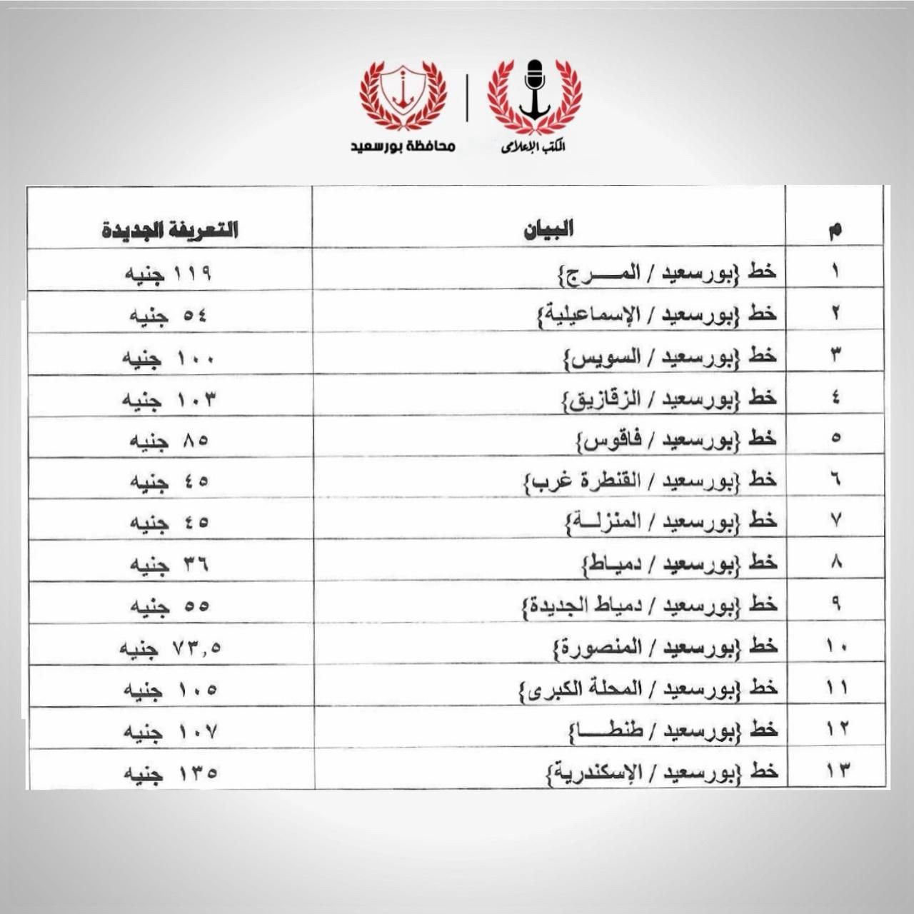 وتم تعديل تعريفة الركوب بين المحافظات، والتي جاءت كما يلي : خط بورسعيد المرج 119 جنيها، وبورسعيد الإسماعيلية 54 جنيها ، وبورسعيد السويس 100 جنيه، بورسعيد الزقازيق 103 جنيهات، وبورسعيد فاقوس 85 جنيها، وبورسعيد القنطرة غرب 45 جنيها، وبورسعيد المنزلة 45 جنيها، وبورسعيد دمياط 36 جنيها، بورسعيد دمياط الجديدة 55 جنيها، وبورسعيد المنصورة 73,5 جنيه، وبورسعيد المحلة الكبري 105 جنيهات، وبورسعيد طنطا 107 جنيهات، وبورسعيد الإسكندرية 135 جنيها.