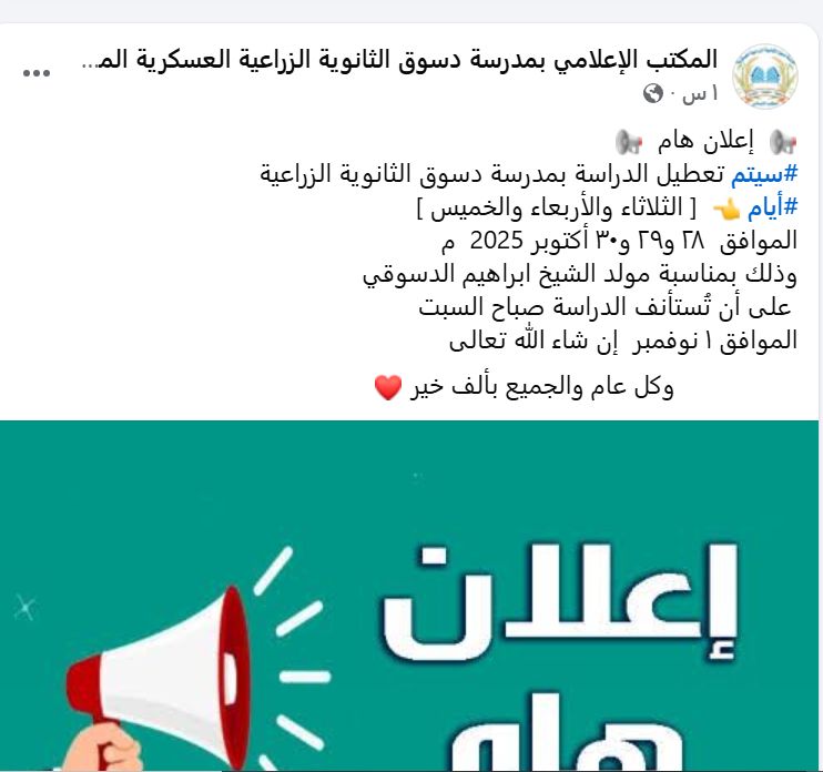 اعلان مدرسة الزراعة بدسوق بتعطيل الدراسة