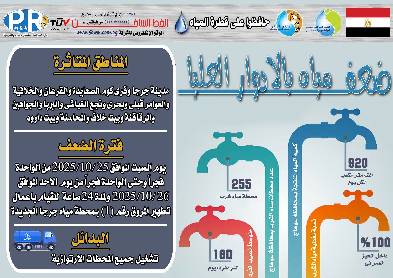 وشركة مياه الشرب والصرف الصحى بسوهاج تهيب بالمواطنين وأصحاب المخابز ومسئولي الهيئات الحكومية والمستشفيات بتوفير كميات المياه المناسبة اللازمة لهم خلال تلك الفترة .