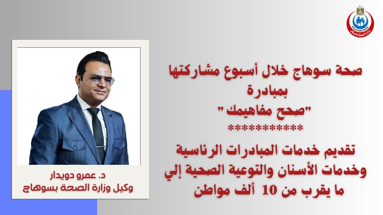 الجمعة، 31 أكتوبر 2025 05:11 مأعلن الدكتور عمرو دويدار، وكيل وزارة الصحة بسوهاج، عن تقديم خدمات المبادرات الرئاسية، وخدمات الأسنان، إلى جانب التوعية والتثقيف الصحي، لما يقرب من 10 آلاف مواطن خلال أسبوع المبادرة، التي هدفت إلى تصحيح المفاهيم الصحية الخاطئة وتعزيز الوعي المجتمعي وبتوجيهات معالي اللواء الدكتور عبدالفتاح سراج محافظ سوهاج، شاركت مديرية الصحة بالمحافظة في فعاليات مبادرة "صحح مفاهيمك"، والتي شهدت إقبالًا واسعًا من المواطنين بمختلف المراكز والقرى.
