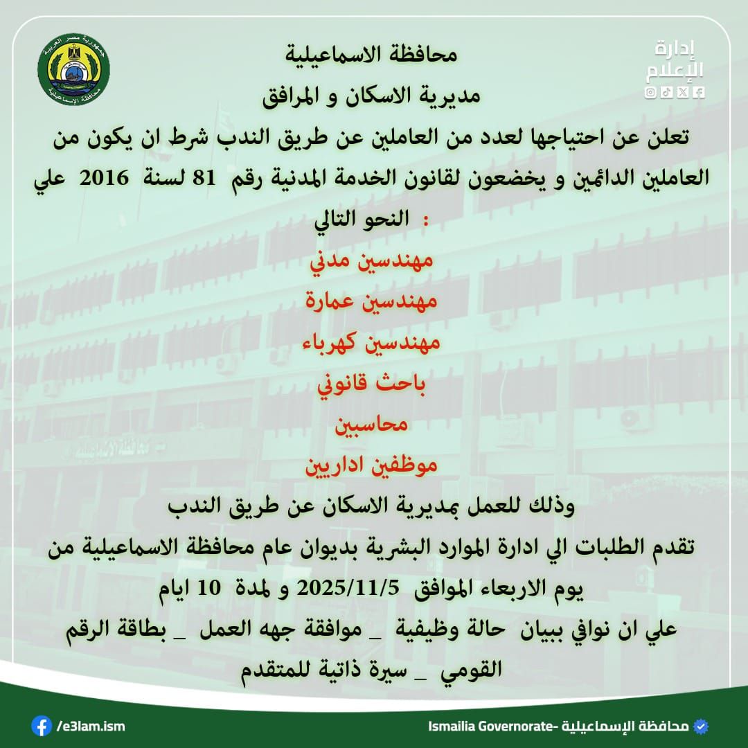 ويأتى هذا الإعلان فى إطار حرص محافظة الإسماعيلية على دعم الكفاءات الفنية والإدارية، وسد الاحتياجات الوظيفية داخل مديرية الإسكان والمرافق بما يحقق تحسين مستوى الخدمات المقدمة للمواطنين.