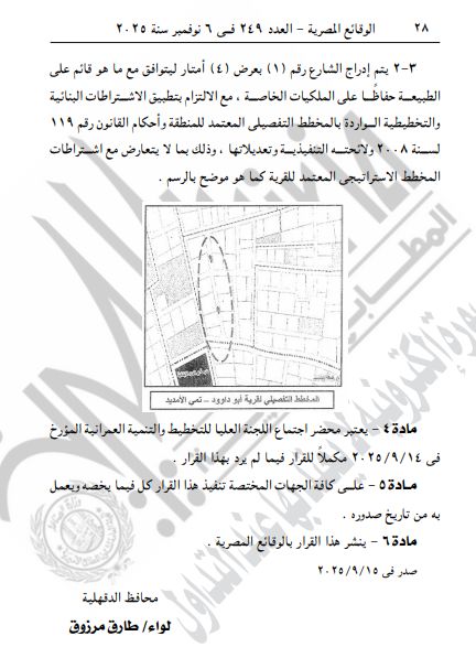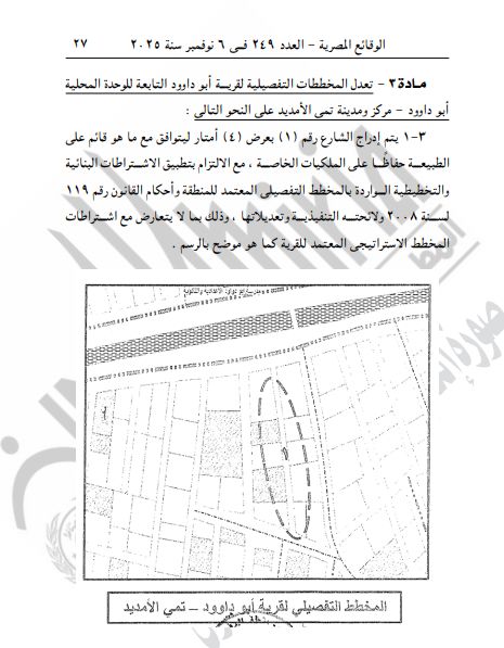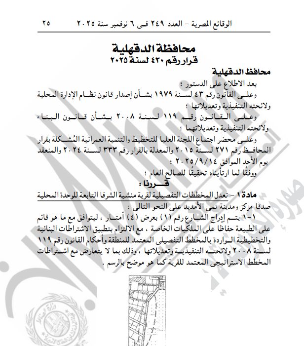 تعديل المخططات التفصيلية لقرية منشية الشرفا التابعة للوحدة المحلية صدقا – مركز تمي الأمديد، وذلك على النحو التالي:إدراج الشارع رقم (1) بعرض 4 أمتار ليتوافق مع الوضع القائم على الطبيعة والملكيات الخاصة، مع الالتزام بالاشتراطات البنائية والتخطيطية الواردة بالمخطط التفصيلي المعتمد، وأحكام القانون رقم 119 لسنة 2008 ولائحته التنفيذية وتعديلاته، بما لا يتعارض مع المخطط الاستراتيجي للقرية.