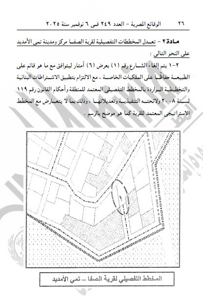 إلغاء الشارع رقم (1) بعرض 6 أمتار ليتوافق مع ما هو قائم على الطبيعة والملكيات الخاصة، مع الالتزام بالاشتراطات البنائية والتخطيطية الواردة بالمخطط التفصيلي، وأحكام القانون رقم 119 لسنة 2008 ولائحته التنفيذية وتعديلاته، بما لا يتعارض مع المخطط الاستراتيجي المعتمد للقرية.