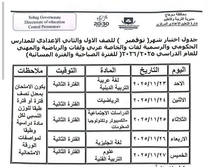الأحد، 16 نوفمبر 2025 07:00 صأعلنت مديرية التربية والتعليم بسوهاج – إدارة التعليم الإعدادي المركزي جدول امتحانات شهر نوفمبر للصفين الأول والثاني الإعدادي للمدارس الحكومية والرسمية لغات والخاصة عربي ولغات، والرياضية والمهنية للعام الدراسي 2024/2025، وذلك للفترتين الصباحية والمسائية.
