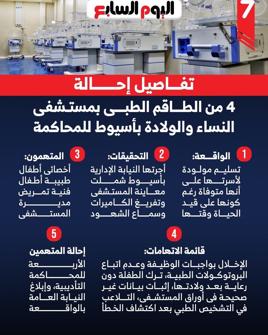 الأحد، 02 نوفمبر 2025 02:19 مينشر اليوم السابع إنفو جراف بعنوان تفاصيل إحالة 4 من الطاقم الطبي بمستشفى النساء والولادة بأسيوط للمحاكمة، الإنفو جراف يلخص تفاصيل الواقعة وتحقيقات النيابة، وقرارها في نقاط معينة، تعرف عليها: