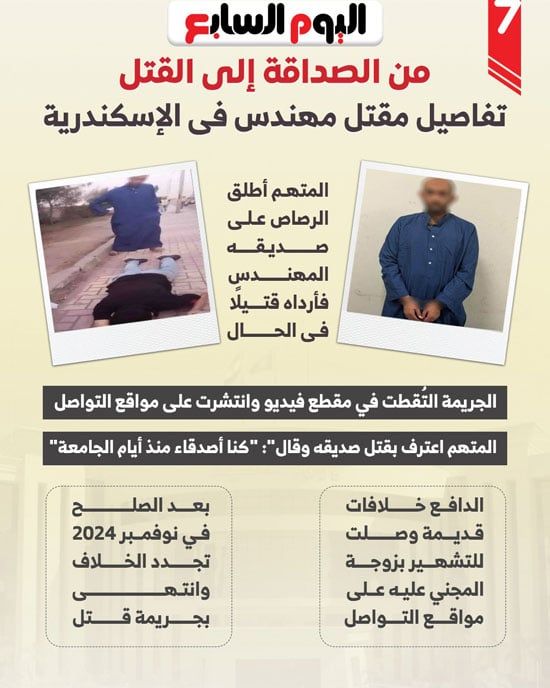 الخميس، 13 نوفمبر 2025 08:22 ميبرز إنفوجراف تفاصيل واقعة مقتل مهندس بمحافظة الإسكندرية حيث قال المتهم في التحقيقات إنه أقدم على ارتكاب الجريمة بدافع الانتقام، بعدما نشبت بينهما خلافات سابقة وصلت إلى حد تعديه على زوجة المجني عليه بالسب والتشهير عبر مواقع التواصل الاجتماعي، قبل أن يتم الصلح بينهما في شهر نوفمبر 2024.