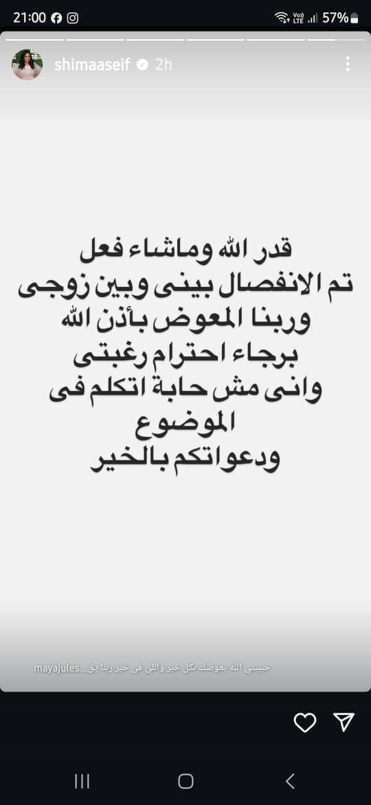 أعلنت الفنانة شيماء سيف انفصالها عن زوجها محمد كارتر، وعلقت قائلة على حسابها على إنستجرام: "قدر الله وما شاء فعل، تم الانفصال بينى وبين زوجى، وربنا المعوض بإذن الله، برجاء احترام رغبتى وإنى مش حابة أتكلم في الموضوع ودعواتكم بالخير".