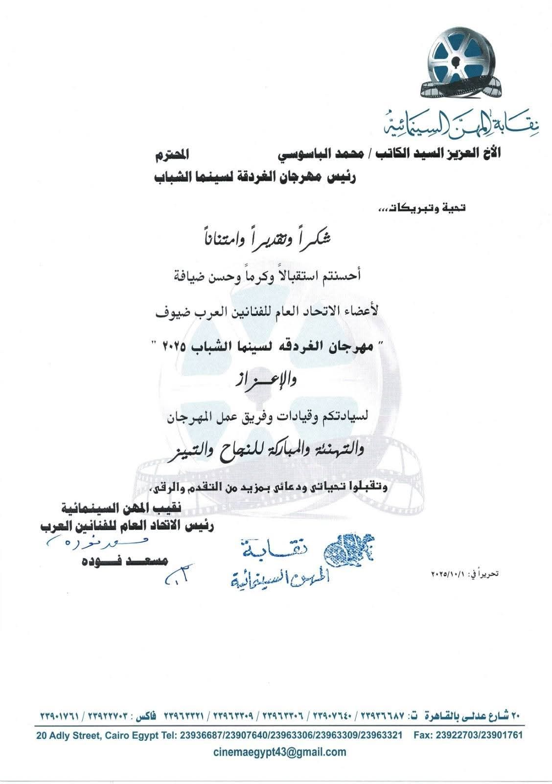 وجاء في بيان النقابة: شكراً وتقديراً وامتناناً لأعضاء إدارة مهرجان الغردقة لسينما الشباب، وعلى رأسهم السيناريست محمد الباسوسي، لحسن الاستقبال وكرم الضيافة لأعضاء اتحاد الفنانين العرب، نبارك هذا النجاح المتميز ونتمنى لكم مزيداً من التقدم والرقي.