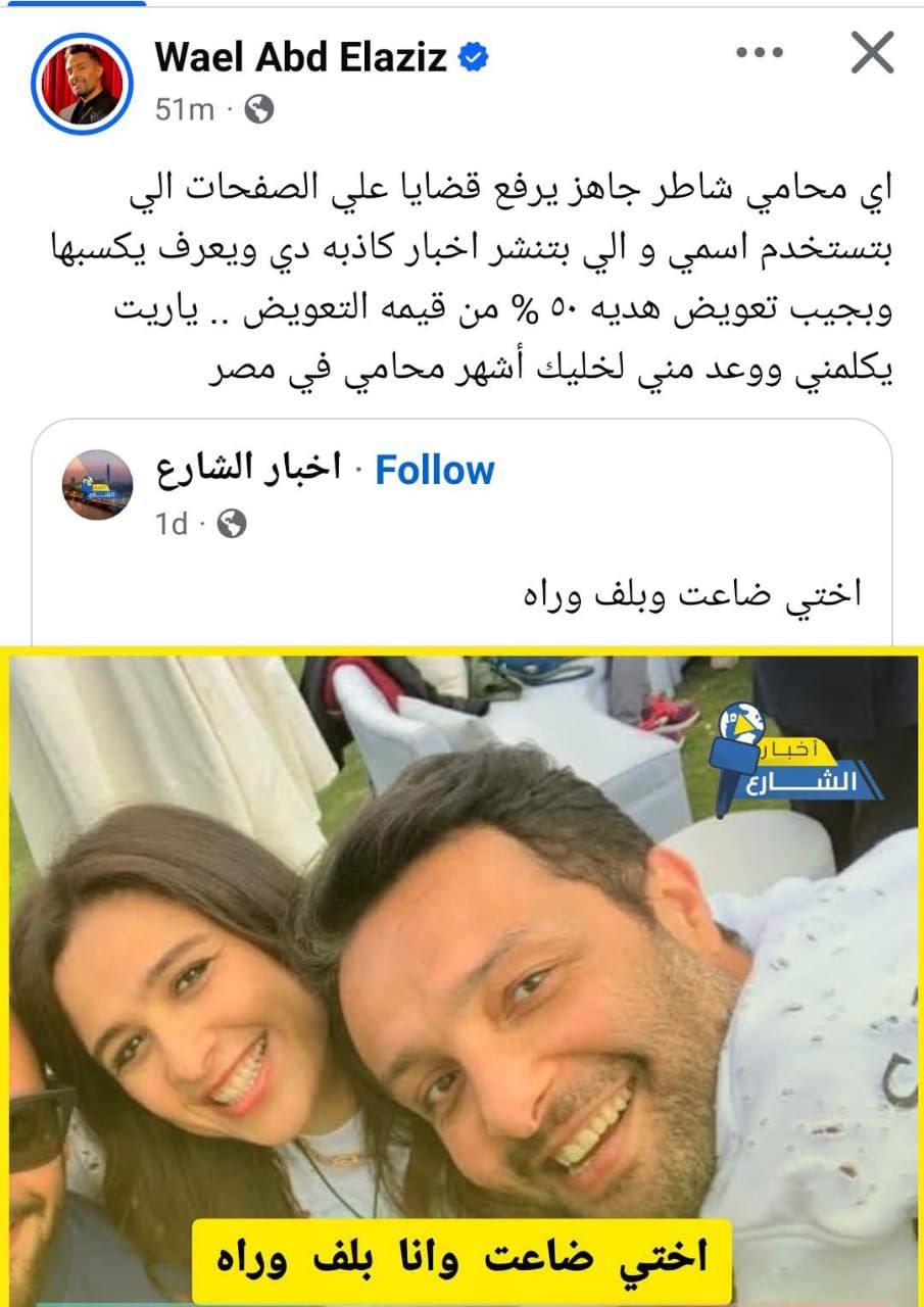 وائل عبد العزيز يتوعد صفحة نشرت خبرا عن ضياع شقيقته ياسمين