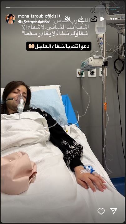 منى فاروق تطالب متابعيها بالدعاءونشرت منى فاروق عبر خاصية الاستورى صورة لها من داخل المستشفى، ظهرت خلالها وهى تتلقى الرعاية الطبية، وعلقت عليها بالدعاء قائلة: "اللهم رب الناس أذهب البأس، اشفِ أنت الشافي، لا شفاء إلا شفاؤك، شفاء لا يغادر سقماً.. دعواتكم بالشفاء العاجل".