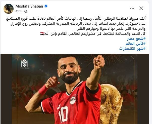الأربعاء، 08 أكتوبر 2025 09:51 ماحتفل النجم مصطفى شعبان بتأهل منتخب مصر، حيث كتب عبر حسابه بموقع فيس بوك: ألف مبروك لمنتخبنا الوطني التأهل رسميا إلى نهائيات كأس العالم 2026 عقب فوزه المستحق على جيبوتي.. إنجاز جديد يُضاف إلى سجل الرياضة المصرية المشرف، ويعكس روح الإصرار والعزيمة التي يتميز بها لاعبونا وجهازهم الفني كل الدعم والمساندة لمنتخبنا في مشوارهم العالمي القادم بإذن الله.