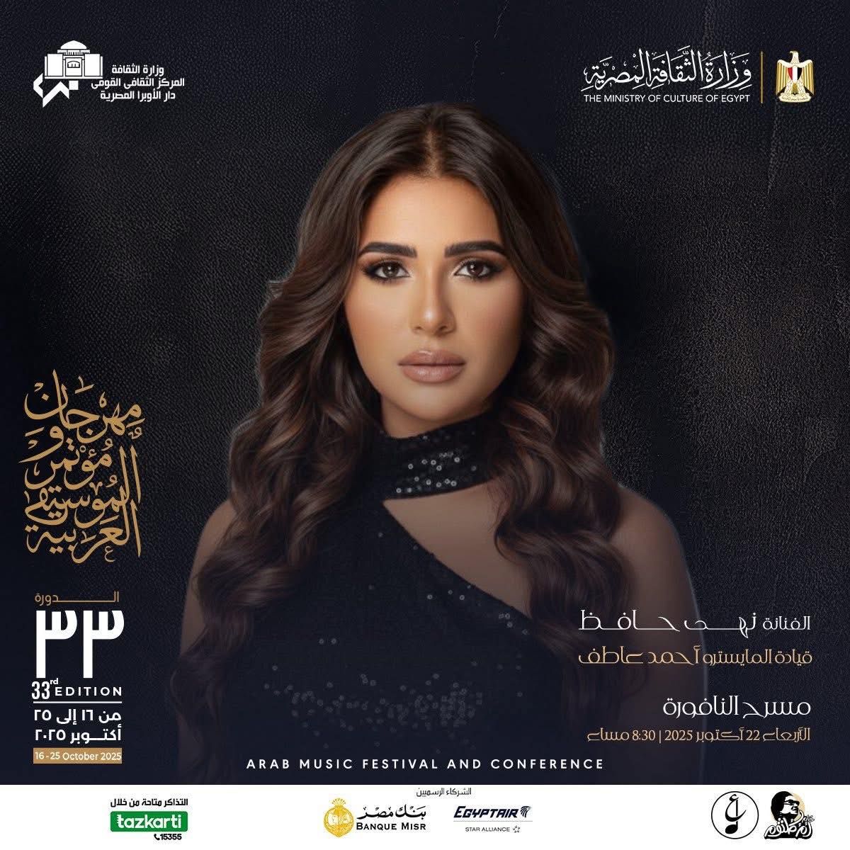 تحيى الفنانة نهى حافظ، إحدى نجوم دار الأوبرا، أمسية فنية استثنائية ضمن فعاليات مهرجان الموسيقى العربية في دورته الثالثة والثلاثين على مسرح النافورة يوم الأربعاء الموافق 22 أكتوبر، تحت قيادة المايسترو أحمد عاطف، حيث تستعرض نهى صوتها الطربي الذي يجذب جمهوراً واسعاً من محبي الموسيقى الأصيلة باغانى من التراث