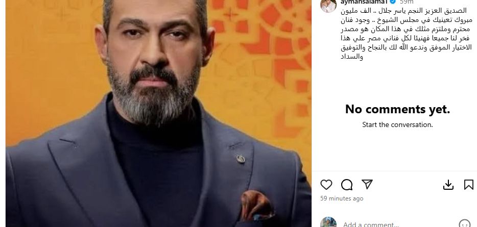 هنأ السيناريست أيمن سلامة صديقه النجم ياسر جلال، على تعيينه في مجلس الشيوخ، وذبك بعد اصدار قرار من رئيس الجمهورية بتعيينه ضمن قائمة مجلس الشيوخ لعام 2026، حيث كتب ايمن صلامة عبر انستجرام قائلا : الصديق العزيز النجم ياسر جلال .. الف مليون مبروك تعينيك في مجلس الشيوخ .. وجود فنان محترم وملتزم مثلك في هذا المكان هو مصدر فخر لنا جميعا فهنيئا لكل فناني مصر علي هذا الاختيار الموفق وندعو الله لك بالنجاح والتوفيق والسداد.