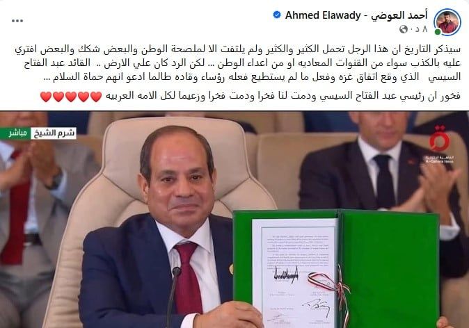 وتابع أحمد العوضي: "لكن الرد كان على الأرض، القائد عبد الفتاح السيسي الذي وقع اتفاق غزة وفعل ما لم يستطيع فعله رؤساء وقادة طالما ادعوا أنهم حماة السلام، فخور أن رئيسي عبد الفتاح السيسي ودمت لنا فخرا ودمت فخرا وزعيما لكل الأمة العربية".