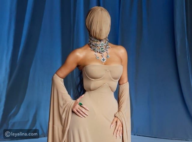 الإطلالة التي أثارت ضجة واسعة تميّزت بفستان بلون النيود، منسجم تماماً مع لون بشرتها، وبتصميم متقن يجمع بين الهيكل الكلاسيكي والتفاصيل المستقبلية، إلا أن العنصر الأكثر إثارة كان القناع الذي غطّى وجهها بالكامل تقريباً، تاركاً مساحة ضيقة للعينين فقط، وبرّرت كيم هذا الاختيار بقولها إنه “يشبه ما تنتجه علامتها التجارية Skims”، في إشارة إلى التشابه في فكرة “الجلد الثاني” التي تقوم عليها منتجاتها.