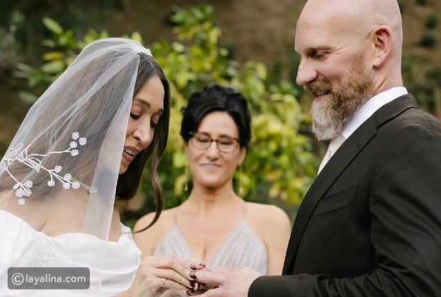العروس التي تبلغ من العمر 42 عامًا، ارتدت فستانًا أبيضًا من تصميم Vivienne Westwood، مستندًا إلى الطراز الكلاسيكي مع تعديلات خاصة تناسب طولها وشكلها، بينما ارتدت مجوهرات عائلية، منها أقراط أماثيست ورثتها عن والدتها، وخاتم زفاف مخصص من الذهب والألماس صممه مصمم المجوهرات Sofia Kaman.