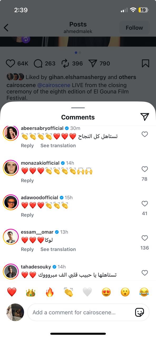 أما الفنان أحمد داوود فبدوره اكتفي في تعليق على بوست مالك بمجموعة من القلوب والتصفيق له، في حين كتبت عبير صبري تستاهل كل النجاح، أما الفنانة مني زكي فاكتفت بمجموعة من القلوب، في حين اكتفى عصام عمر بكتابة : "لوكا"، أما الفنان طه الدسوقي والذى شكل مع مالك ثنائياً مميزاً في مسلسل ولاد الشمس فكتب تستاهلها يا حبيب قلبي ألف مبروك .