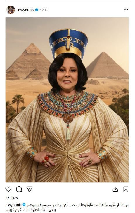 أعربت الفنانة والإعلامية إسعاد يونس، عن سعادتها وفخرها باقتراب موعد افتتاح المتحف المصري الكبير غداً السبت، حيث شاركت صورة بالزي الفرعوني بالـ AI على حسابها على "انستجرام" وعلقت قائلة: "وزنك تاريخ وجغرافيا وحضارة وعلم وأدب وفن وشعر وموسيقى ووعي يبقى القدر اختارك انك تكون كبير".