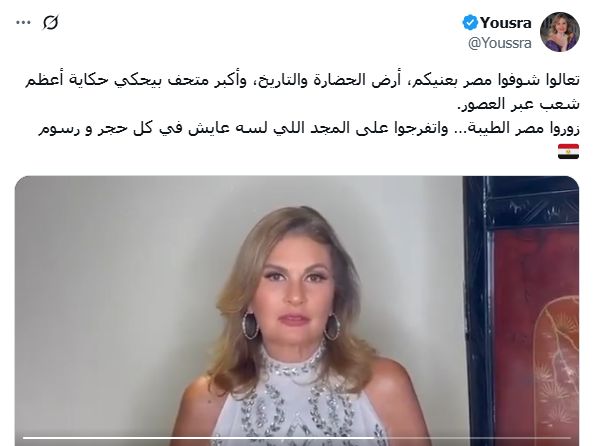 وقالت يسرا، عبر حسابها على منصة X: "تعالوا شوفوا مصر بعنيكم، أرض الحضارة والتاريخ، وأكبر متحف بيحكي حكاية أعظم شعب عبر العصور"، مضيفة: "زوروا مصر الطيبة واتفرجوا على المجد اللي لسه عايش في كل حجر ورسوم".