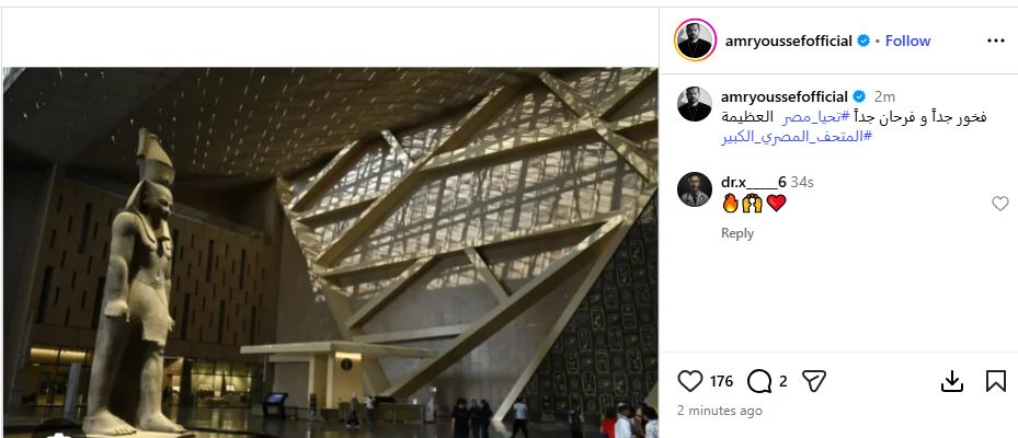 عبر النجم عمرو يوسف عن اعتزازه بافتتاح المتحف الكبير، الذى أقيم منذ قليل وسط حضور الرئيس السيسى وعدد من ملوك ورؤساء العالم، حيث كتب عبر صفحته الشخصية على انستجرام قائلا:
