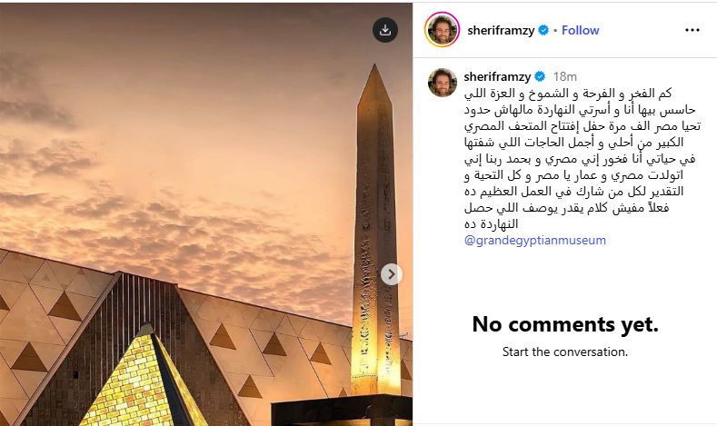 عبر الفنان شريف رمزى عن اعتزازه بافتتاح المتحف الكبير، الذى أقيم منذ قليل وسط حضور الرئيس السيسى وعدد من ملوك ورؤساء العالم، حيث كتب عبر صفحته الشخصية على إنستجرام قائلا: كم الفخر والفرحة والشموخ والعزة اللي حاسس بيها أنا وأسرتي النهاردة مالهاش حدود تحيا مصر ألف مرة حفل إفتتاح المتحف المصري الكبير من أحلي و أجمل الحاجات اللي شفتها في حياتي أنا فخور إني مصري و بحمد ربنا إني اتولدت مصري وعمار يا مصر وكل التحية والتقدير لكل من شارك في العمل العظيم ده فعلاً مفيش كلام يقدر يوصف اللي حصل النهاردة ده.
