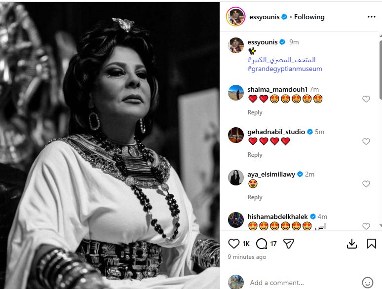 عبرت النجمة القديرة اسعاد يونس عن اعتزازها بافتتاح المتحف الكبير، الذى أقيم منذ قليل وسط حضور الرئيس السيسى وعدد من ملوك ورؤساء العالم، حيث كتب عبر صفحته الشخصية على إنستجرام قائلة: افتتاح المتحف الكبير فخر عظيم.. وذلك عبر صورة لها بالملابس الفرعونية