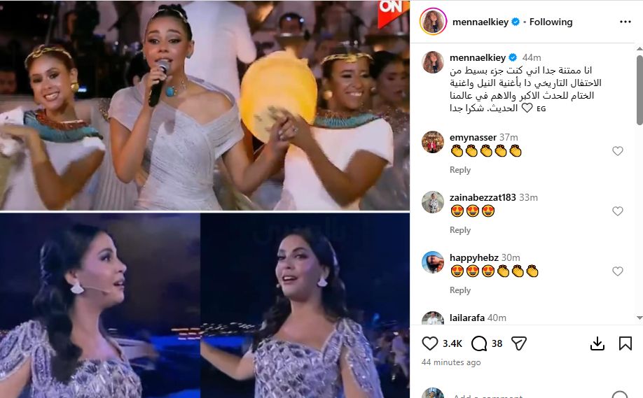 عبرت الشاعرة منة القيعى عن اعتزازها بافتتاح المتحف المصرى الكبير، الذى أقيم منذ قليل وسط حضور الرئيس السيسى وعدد من ملوك ورؤساء العالم، حيث كتبت عبر صفحته الشخصية على إنستجرام قائلة: أنا ممتنة جدا إني كنت جزء بسيط من الاحتفال التاريخي دا بأغنية النيل وأغنية الختام للحدث الأكبر والأهم في عالمنا الحديث شكرا جدا.