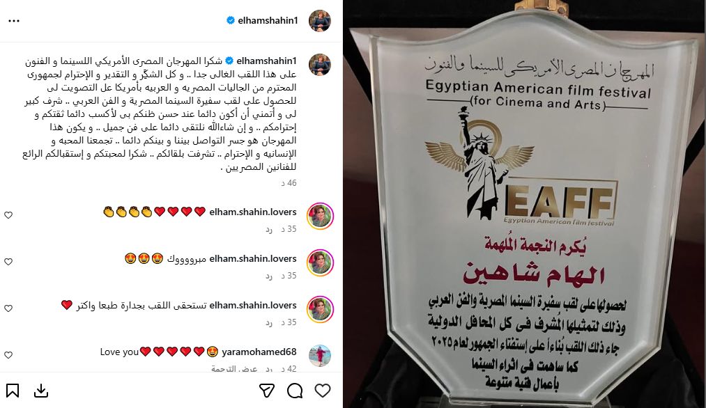 عبرت الفنانة إلهام شاهين عن شعادتها بلقب سفيرة الفن المصرى والعربى، حيث منح المهرجان المصرى الامريكى للسينما والفنون اللقب لالهام شاهين، وكتبت الهام شاهين على صفحتها الشخصية على موقع انستجرام قائلة: شكرا المهرجان المصرى الأمريكي اللسينما والفنون على هذا اللقب الغالى جدا.. وكل الشكًِر والتقدير والإحترام لجمهورى المحترم من الجاليات المصريه والعربيه بأمريكا عل التصويت لى للحصول على لقب سفيرة السينما المصرية والفن العربي.. شرف كبير لى وأتمني أن أكون دائما عند حسن ظنكم بى لأكسب دائما ثقتكم وإحترامكم.. وإن شاءالله نلتقى دائما على فن جميل.. ويكون هذا المهرجان هو جسر التواصل بيننا وبينكم دائما.. تجمعنا المحبه والإنسانيه والإحترام .. تشرفت بلقائكم.. شكرا لمحبتكم وإستقبالكم الرائع للفنانين المصريين".