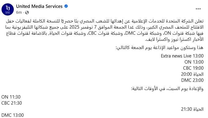 أعلنت الشركة المتحدة للخدمات الإعلامية عن إهدائها للشعب المصري بثا حصريًا للنسخة الكاملة لفعاليات حفل الافتتاح للمتحف المصري الكبير، وذلك غدا الجمعة الموافق 7 نوفمبر 2025 على جميع شبكاتها التليفزيونية بما فيها شبكة قنوات ON، وشبكة قنوات DMC، وشبكة قنوات CBC، وشبكة قنوات الحياة، بالإضافة لقنوات قطاع الأخبار إكسترا نيوز وإكسترا لايف.