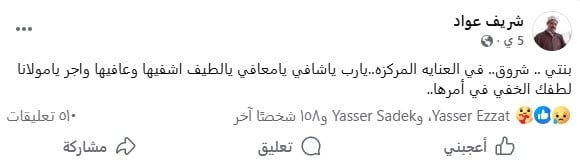وكتب شريف عواد عبر حسابه على "فيس بوك": "يارب في هذا اليوم المبارك.. اشفي بنتي شروق.. يا قادر على كل شيء".