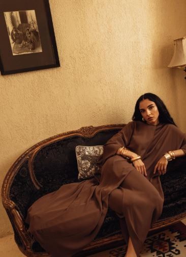 وظهرت في موقع أخر داخلي بفستان من اللون البني فضفاض، مستوحاه من الفلكلور المصري.