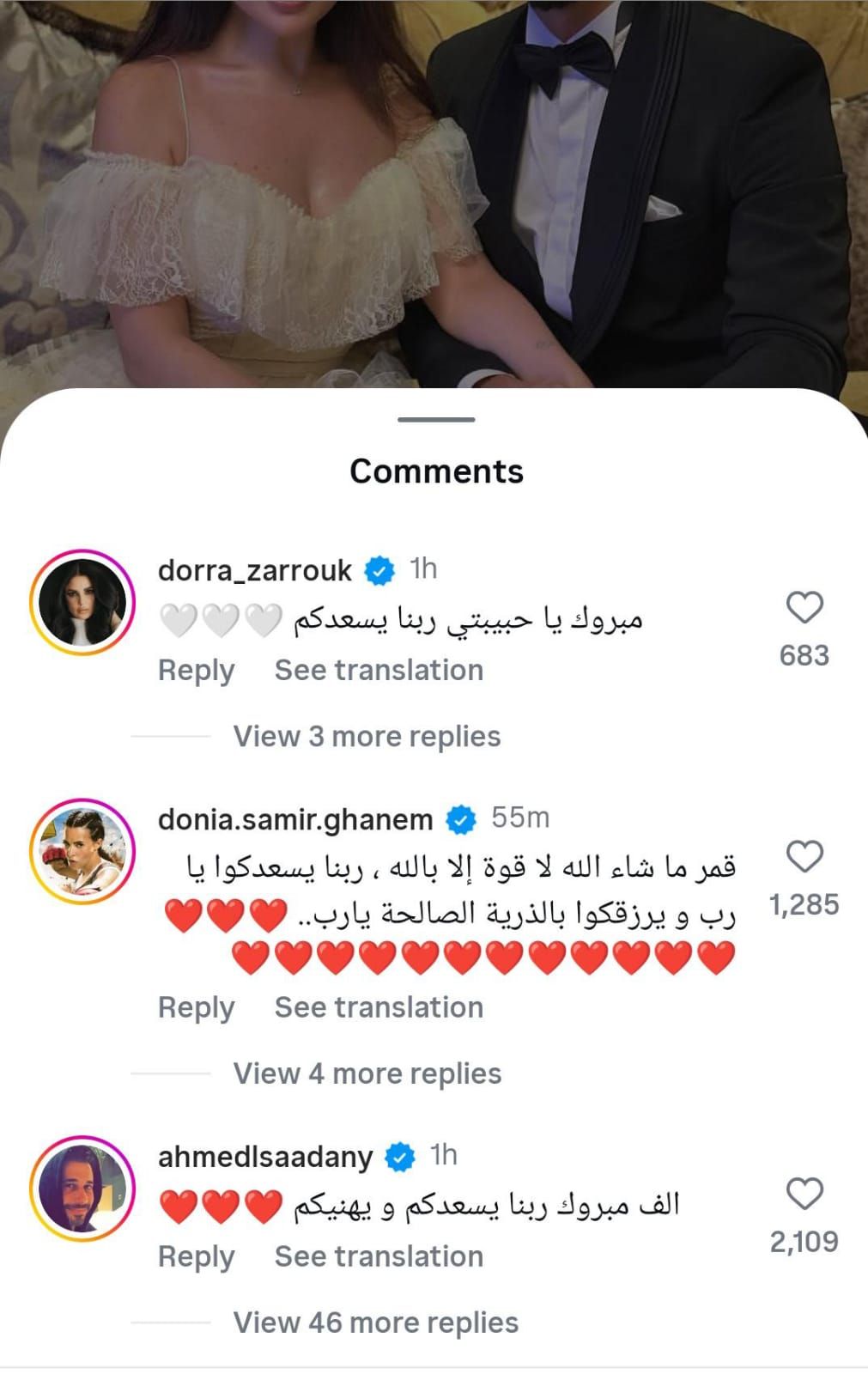 حرص عدد كبير من النجوم والفنانين على تهنئة النجمة مي عز الدين، بزواجها على أحمد تيمور، وسارع الكثيرون في التعليقات على تهنئتها، ومن أبرز هؤلاء النجمة والنجمة دنيا ، والنجم آسر ياسين، والفنانة مي كساب، والنجمة غادة عبد الرازق، والنجمة .