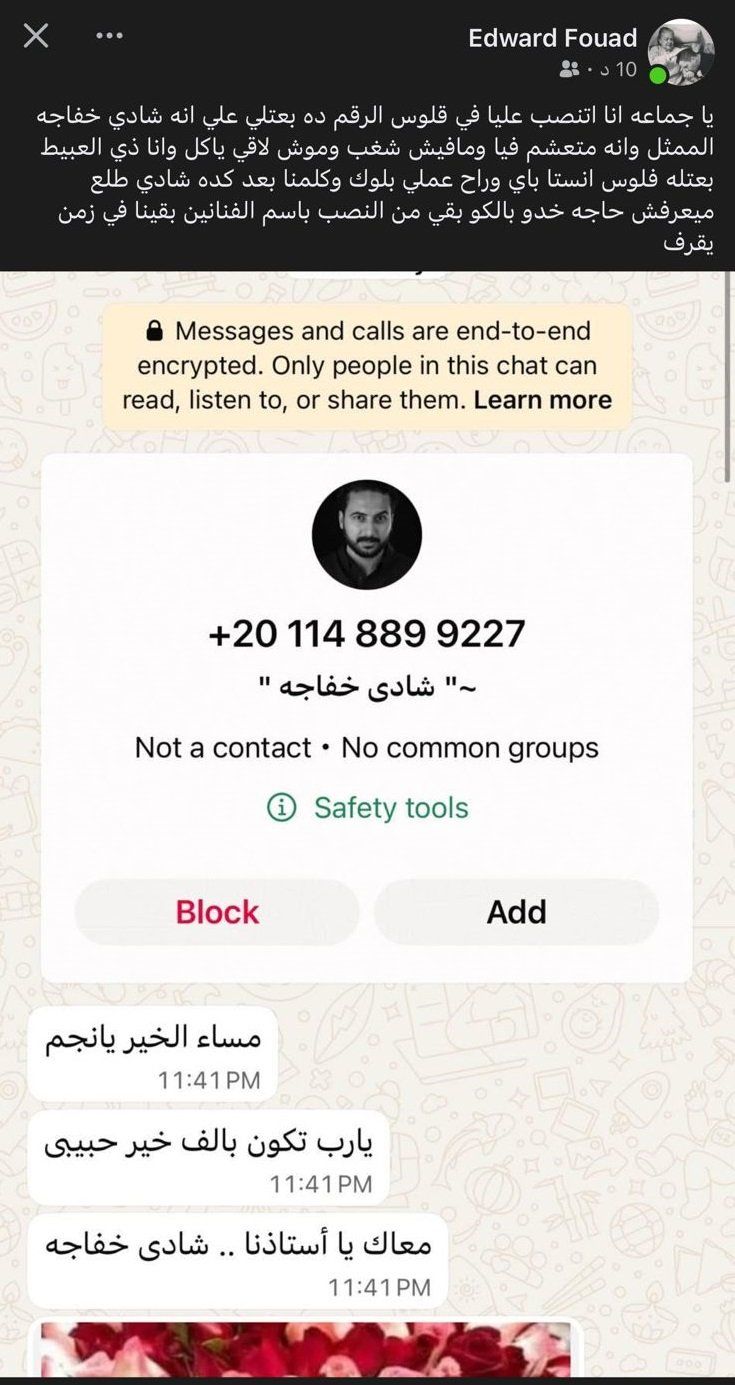 وأشار إدوارد إلى أنه تواصل لاحقًا مع الفنان شادي خفاجة الذي نفى تمامًا علمه بالأمر، مؤكداً أنه لم يتواصل معه من الأساس، وطالب إدوارد الجمهور بالتحلي بالحذر وعدم الوثوق في أي رسائل تأتي من أرقام مجهولة تنتحل أسماء فنانين أو شخصيات معروفة، مؤكدًا أن “زمن النصب أصبح مزعجًا بصورة لا تُحتمل.