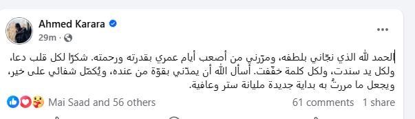 وتابع أحمد كرارة: "شكرًا لكل قلب دعا، ولكل يد سندت، ولكل كلمة خفّفت، أسأل الله أن يمدّني بقوّة من عنده، ويُكمّل شفائي على خير، ويجعل ما مررتُ به بداية جديدة مليانة ستر وعافية".