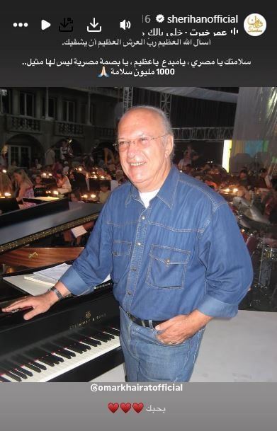 الإثنين، 17 نوفمبر 2025 01:22 موجهت النجمة شريهان رسالة للموسيقار الكبير عمر خيرت وذلك بالتزامن مع وعكته الصحية التي مر بها، حيث نشرت شريهان ستوري على حسابها بموقع انستجرام وجهت فيه دعاء بالشفاء حيث كتبت اسال الله العظيم رب العرش العظيم أن يشفيك واختتمت رسالتها للموسيقار الكبير بكلمة "بحبك".