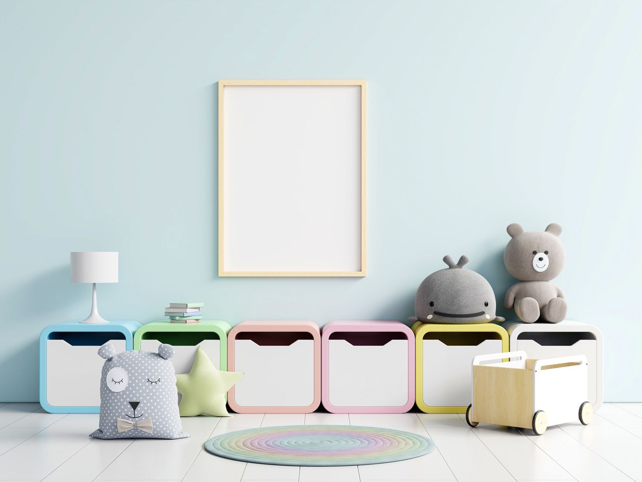 في هذه الصورة نرى ركناً مخصصاً لألعاب الأطفال داخل غرفة مرتبة بعناية، حيث طفلة صغيرة واقفة أمام وحدة تخزين مقسمة إلى مربعات، وهي تتعامل مع بعض الألعاب.